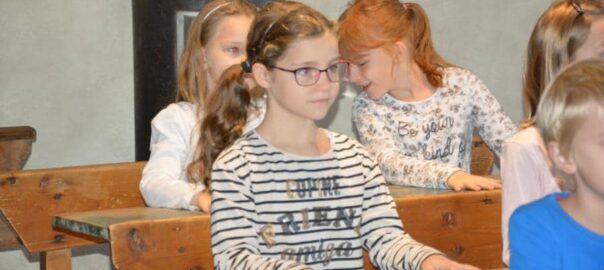 Die Schüler saßen plötzlich in den Schulbänken ihrer Groß- und Urgroßeltern und erlebten hautnah, wie Schule früher war.  Dazu gehörte natürlich auch die richtige Haltung und das Rohrstaberl, das uns während der gesamten Führung begleitete (natürlich nur als Zeigestab 🙂 ).