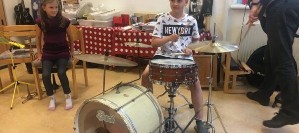 … zählten wir ein und die 4 Musiklehrer der Musikschule Laa/Thaya spielten auf. Sie stellten uns nach und nach die mitgebrachten Instrumente vor: Schlagzeug, Gitarren, Blechblasinstrumente und Holzblasinstrumente.